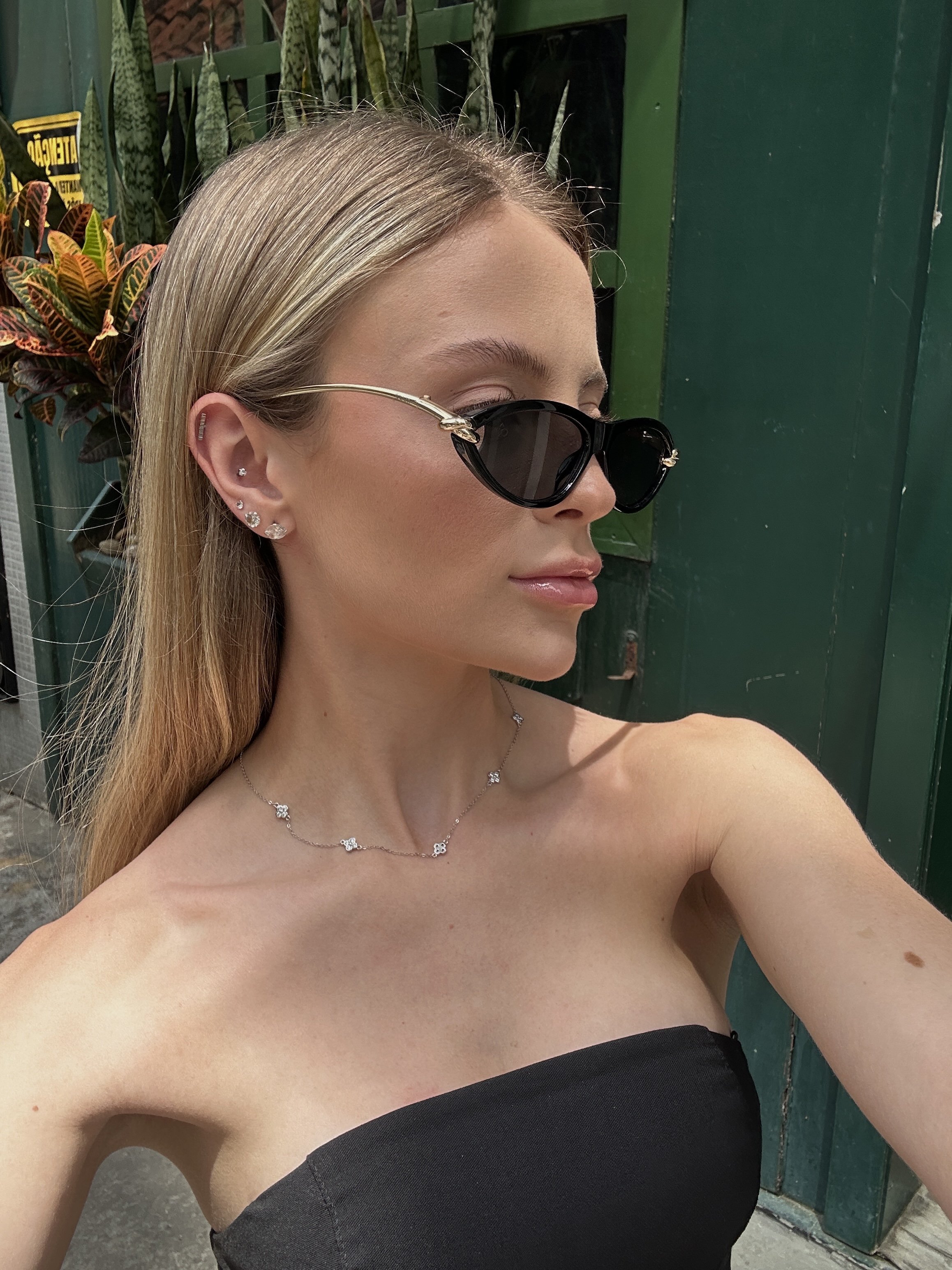 Com seu design cat-eye escultural, ela valoriza o olhar com atitude e personalidade. O detalhe do nó nas hastes em metal dourado traz sofisticação e transforma o acessório em uma verdadeira joia. A frente em acetato preto intenso adiciona profundidade e contraste, criando uma peça impactante e inesquecível.